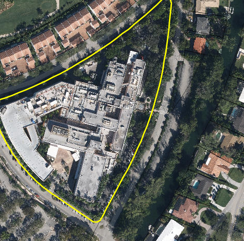 This is a satellite view of the Doctors Hospital (Baptist Health) parking lot leased from the City of Coral Gables showing the lot and the green barrier between the lot and the neighborhood streets (Granada, Carillo, Pisano).